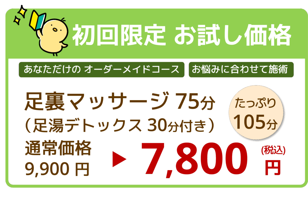 子宮から温める 足裏オイルテラピー60分+足湯デトックス30分セット 90分 9,400円
