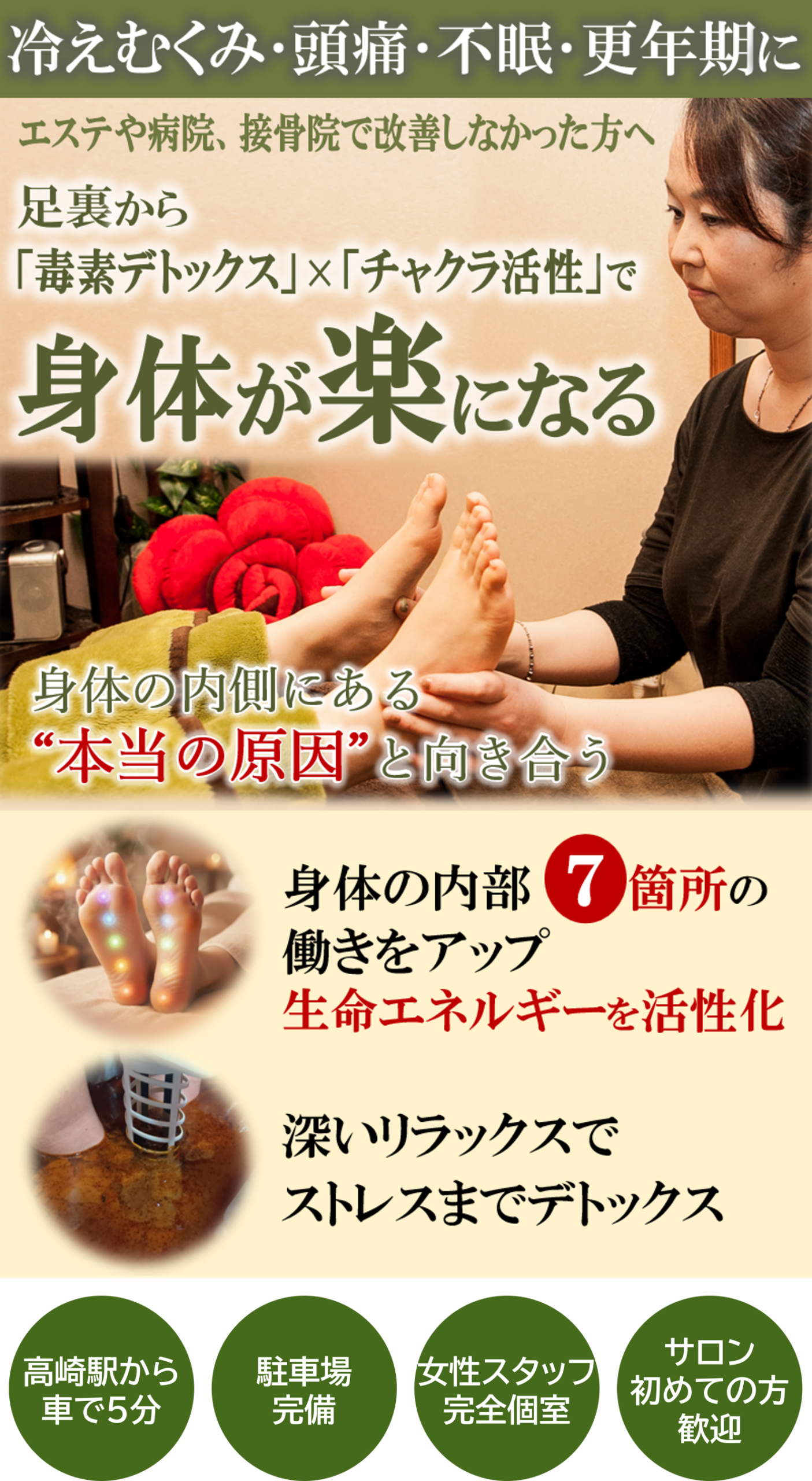「足湯デトックス」と「チャクラエネルギー調整」を組み合わせた、身体の内側から整えるための本格的なケア です。